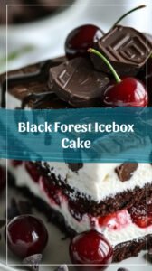 No-bake Black Forest Icebox Cake! Layers of chocolate wafers, cherry pie filling & whipped cream create a stunning, easy dessert. Perfect for summer & make-ahead magic. Black Forest cake, no-bake …